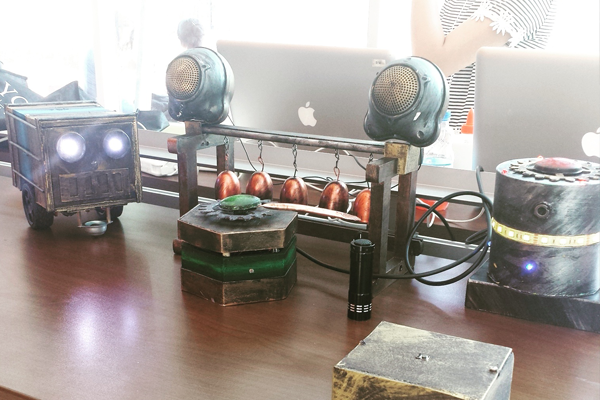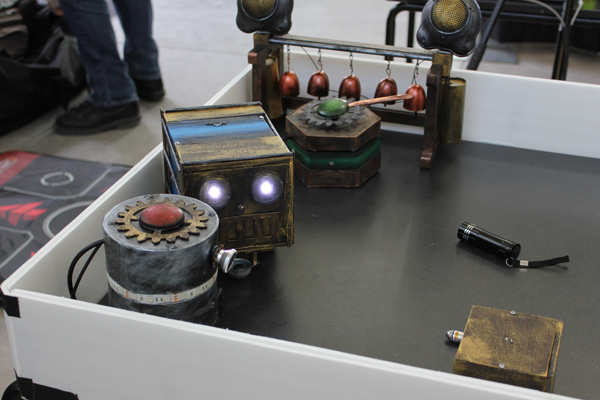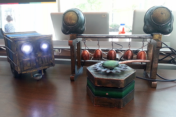 Roshambo (2015) is an interactive installation that consists of three autonomous robots named Flux, Lucent, and Resonant. Each robot has a special trait that it uses to vie for the audience's attention and a sensory weakness that will temporarily disable it. The trait of one robot is the weakness of another, just like in a game of roshambo i.e. rock-paper-scissors.