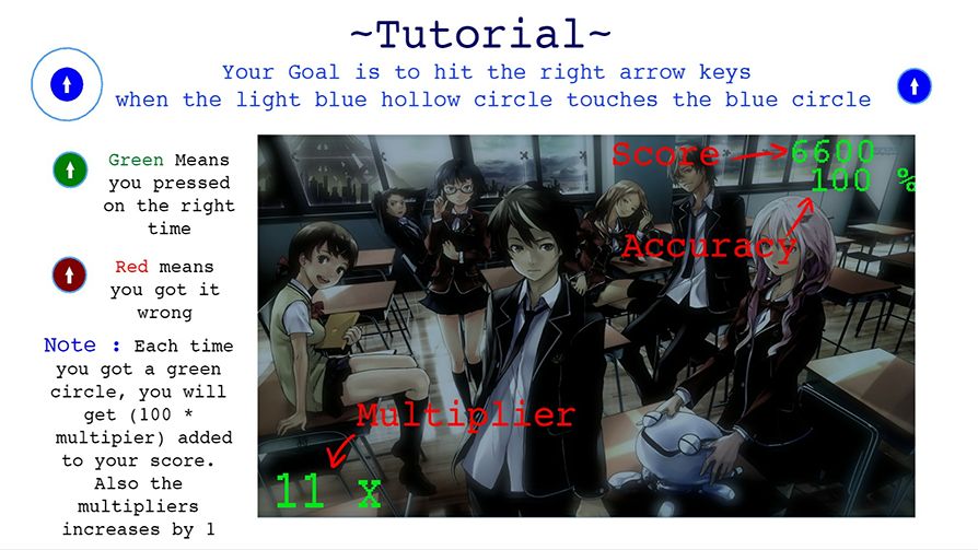 Beat It (2013) is a Rhythm game based on a popular freeware rhythm game Osu. The game's aethetics follows a popular Japanese Culture Animes. It features the following animes and it's main theme songs.